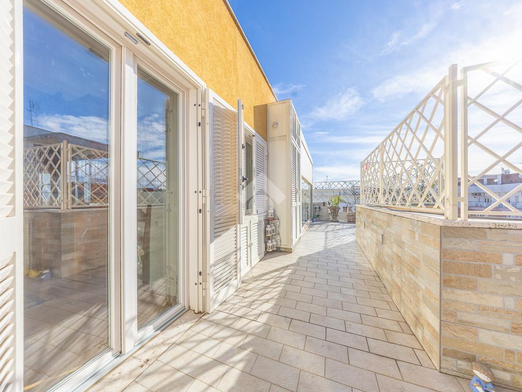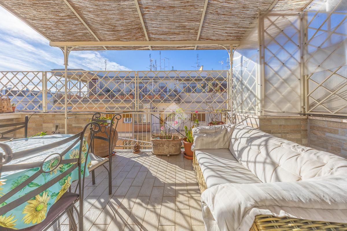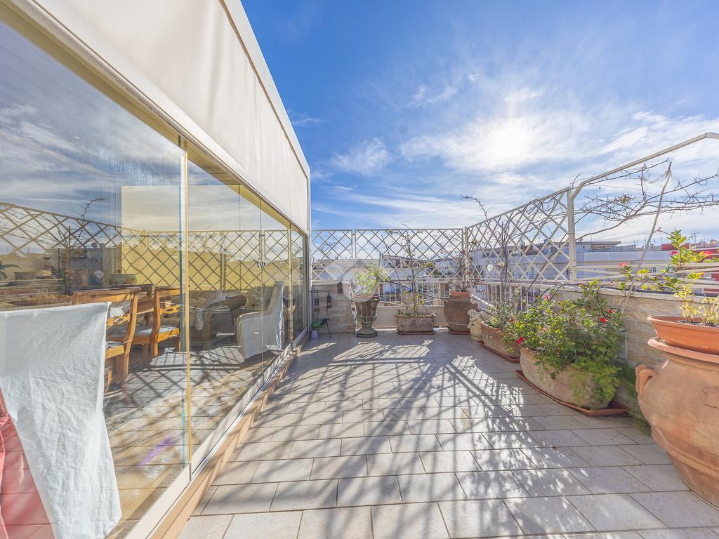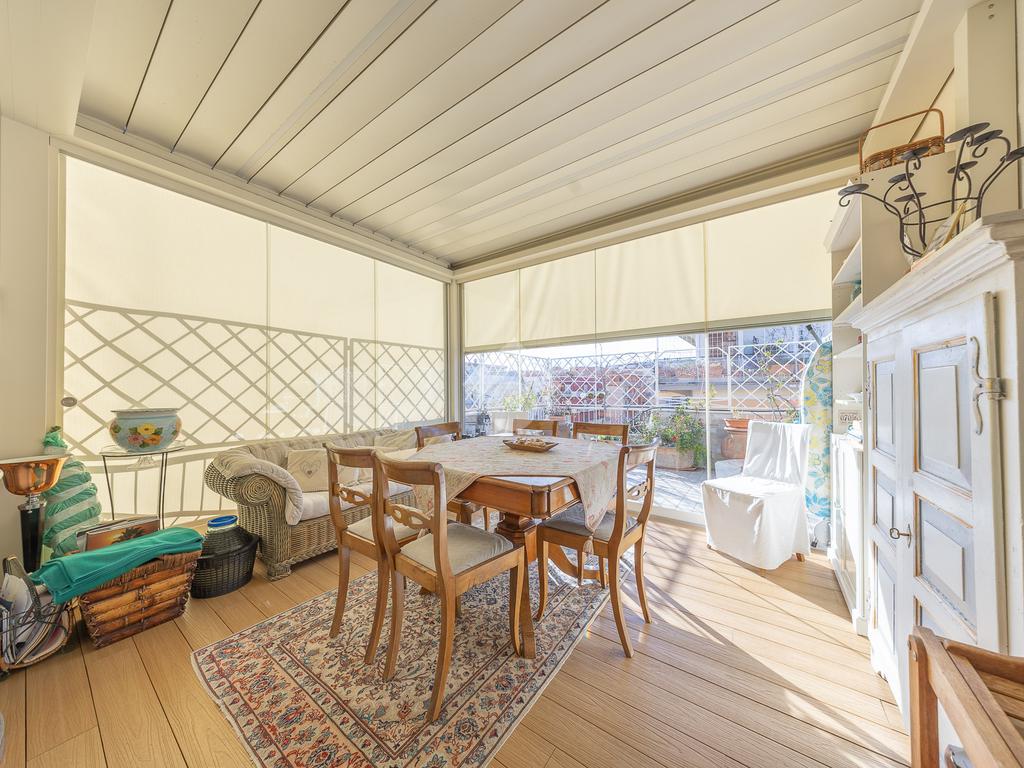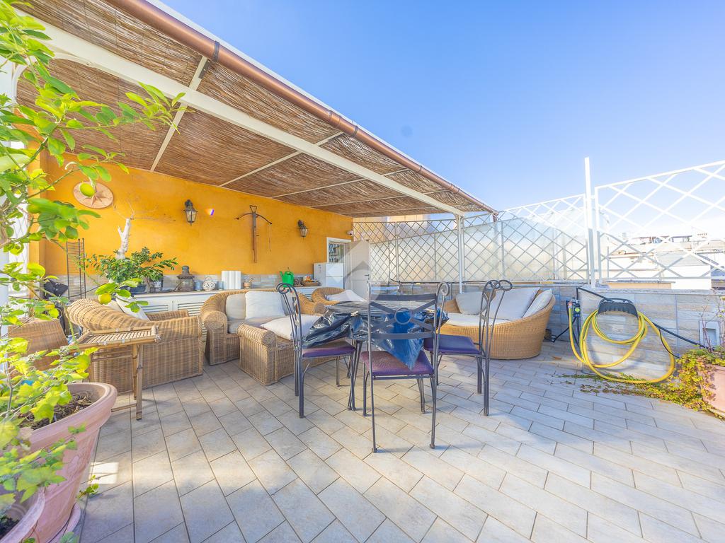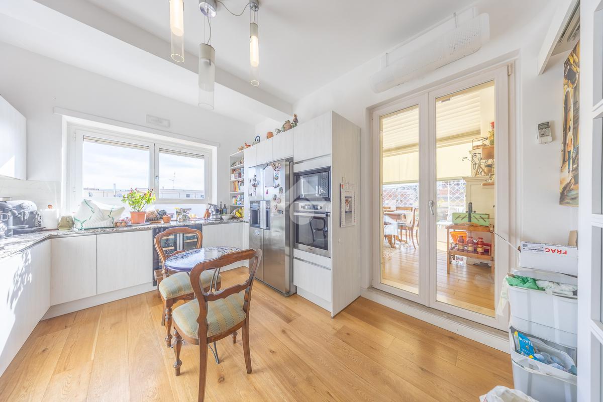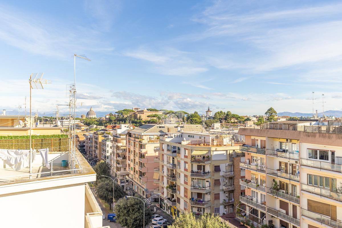 Posto al sesto piano, l’attico si compone di: ingresso, ampio salone, due camere da letto, cucina abitabile, due bagni di cui uno con cabina armadio e due splendidi terrazzi. Il primo regala una veduta straordinaria sulla Cupola di San Pietro, mentre il secondo è dotato di pergotenda domotica, ideale per vivere lo spazio esterno tutto l’anno grazie al tetto apribile. I terrazzi rappresentano un ambiente perfetto per pranzi all’aperto, momenti di relax e convivialità. In tutti gli ambienti sono presenti armadi fatti su misura da un falegname.