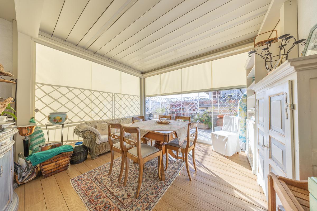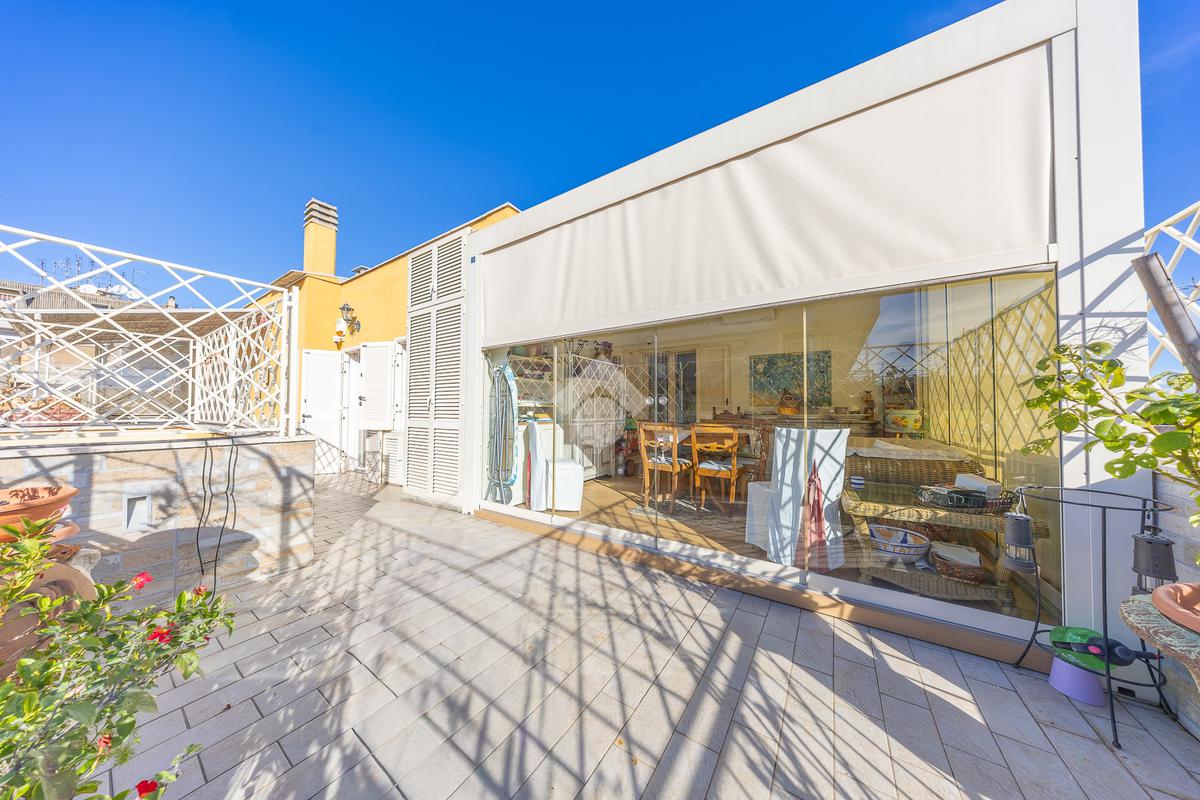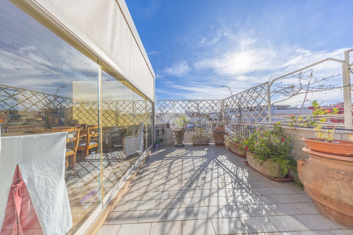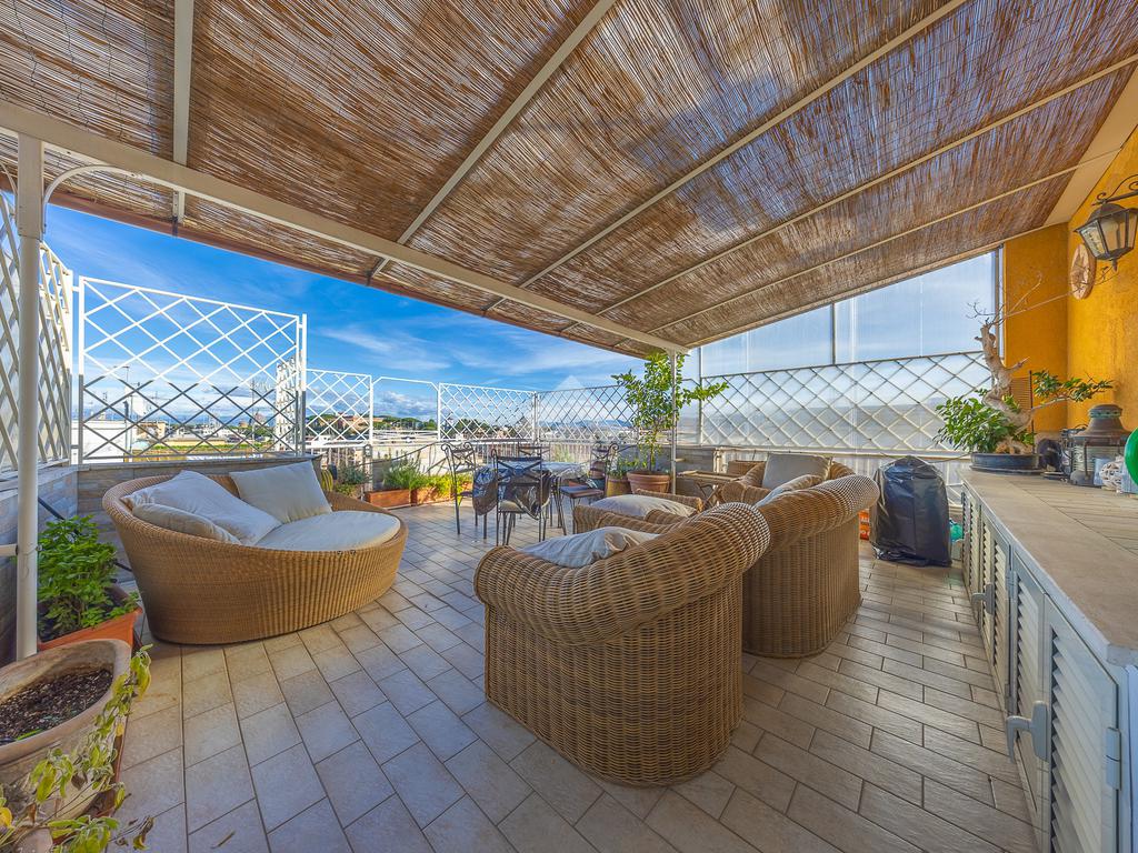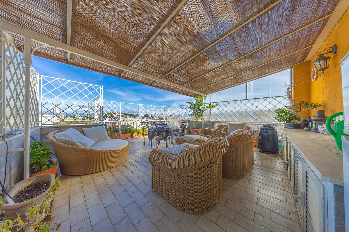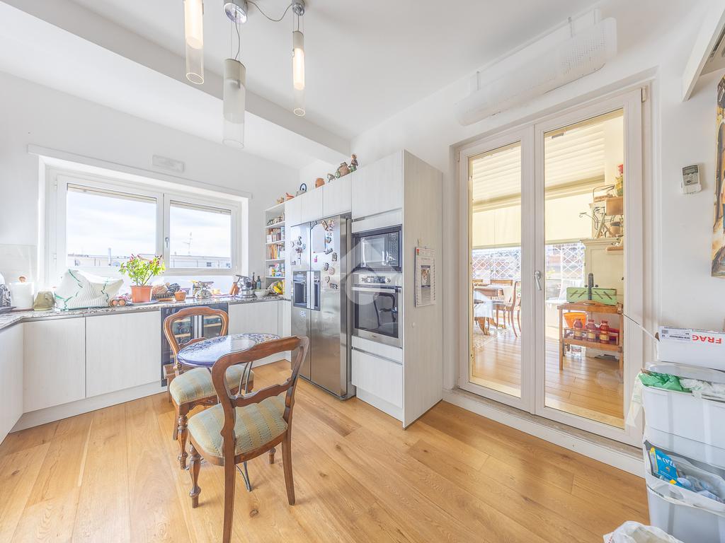 Posto al sesto piano, l’attico si compone di: ingresso, ampio salone, due camere da letto, cucina abitabile, due bagni di cui uno con cabina armadio e due splendidi terrazzi. Il primo regala una veduta straordinaria sulla Cupola di San Pietro, mentre il secondo è dotato di pergotenda domotica, ideale per vivere lo spazio esterno tutto l’anno grazie al tetto apribile. I terrazzi rappresentano un ambiente perfetto per pranzi all’aperto, momenti di relax e convivialità. In tutti gli ambienti sono presenti armadi fatti su misura da un falegname.