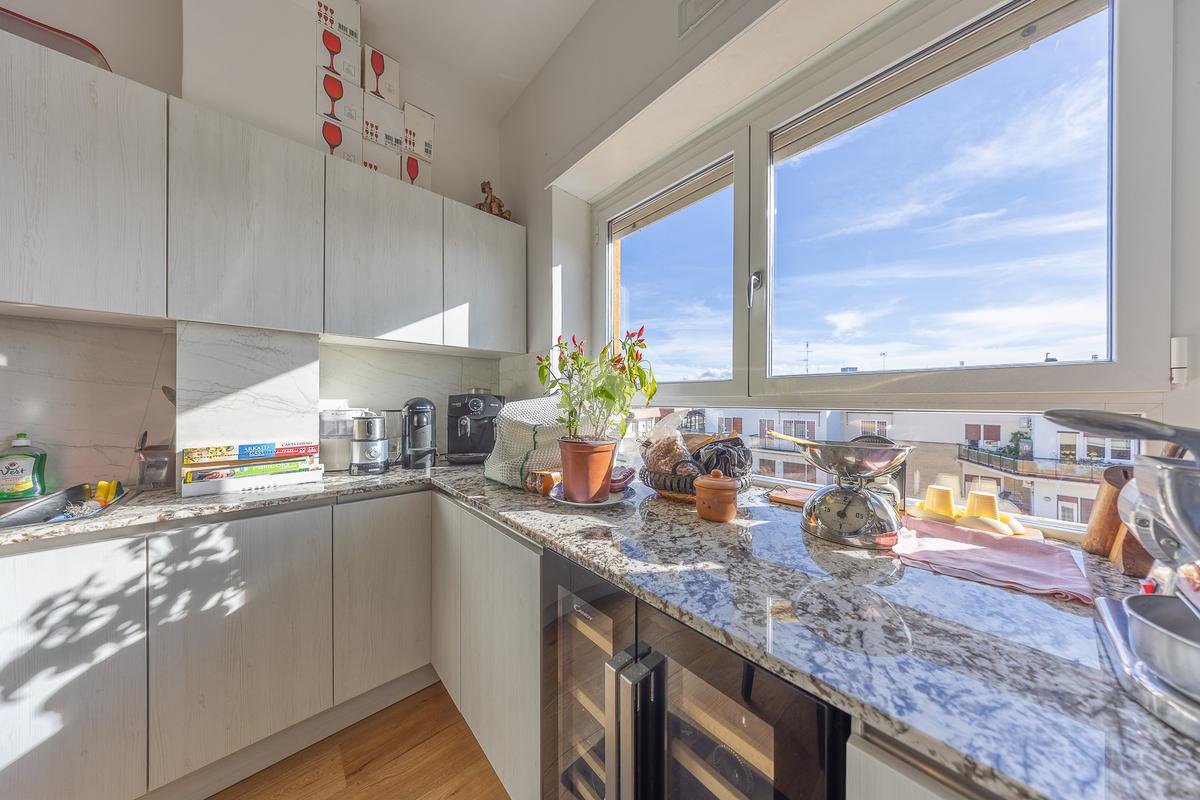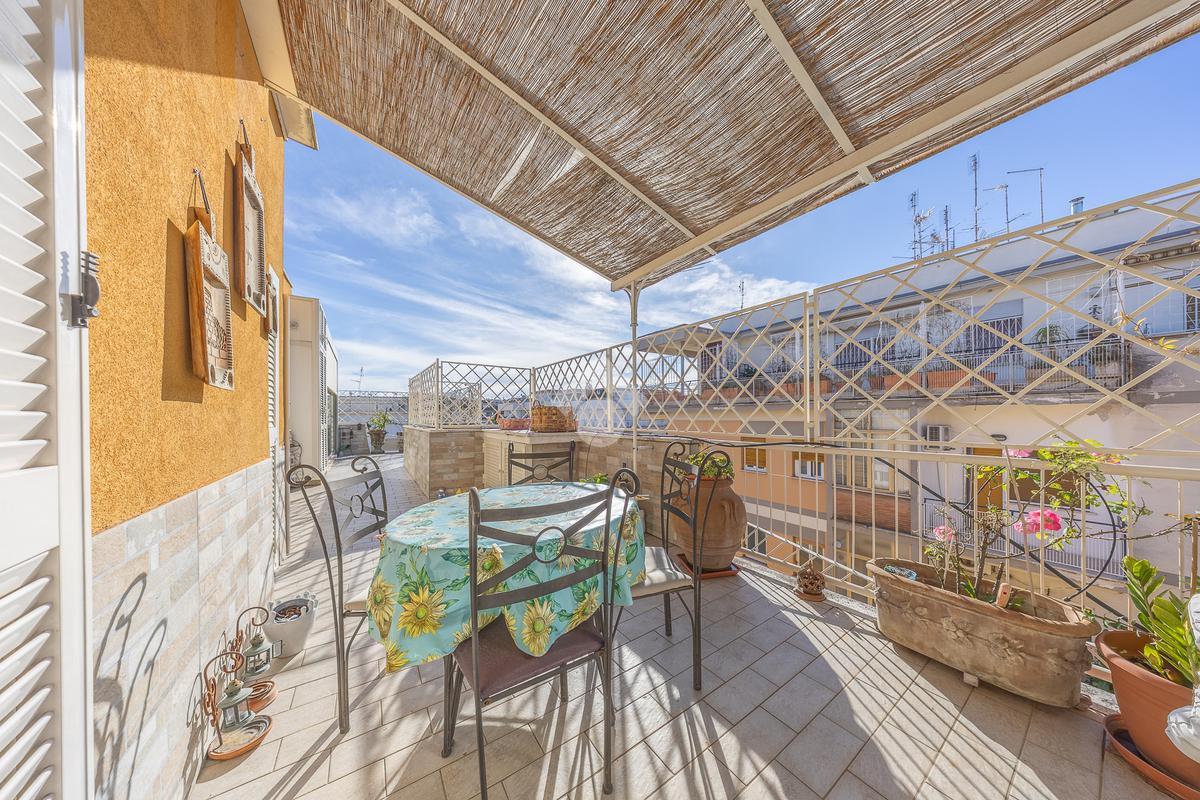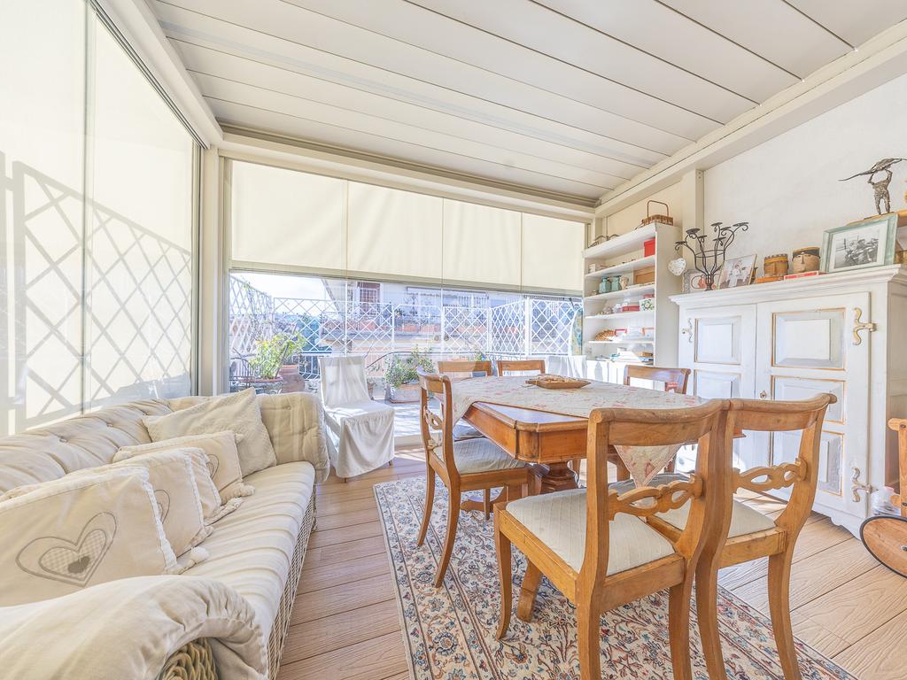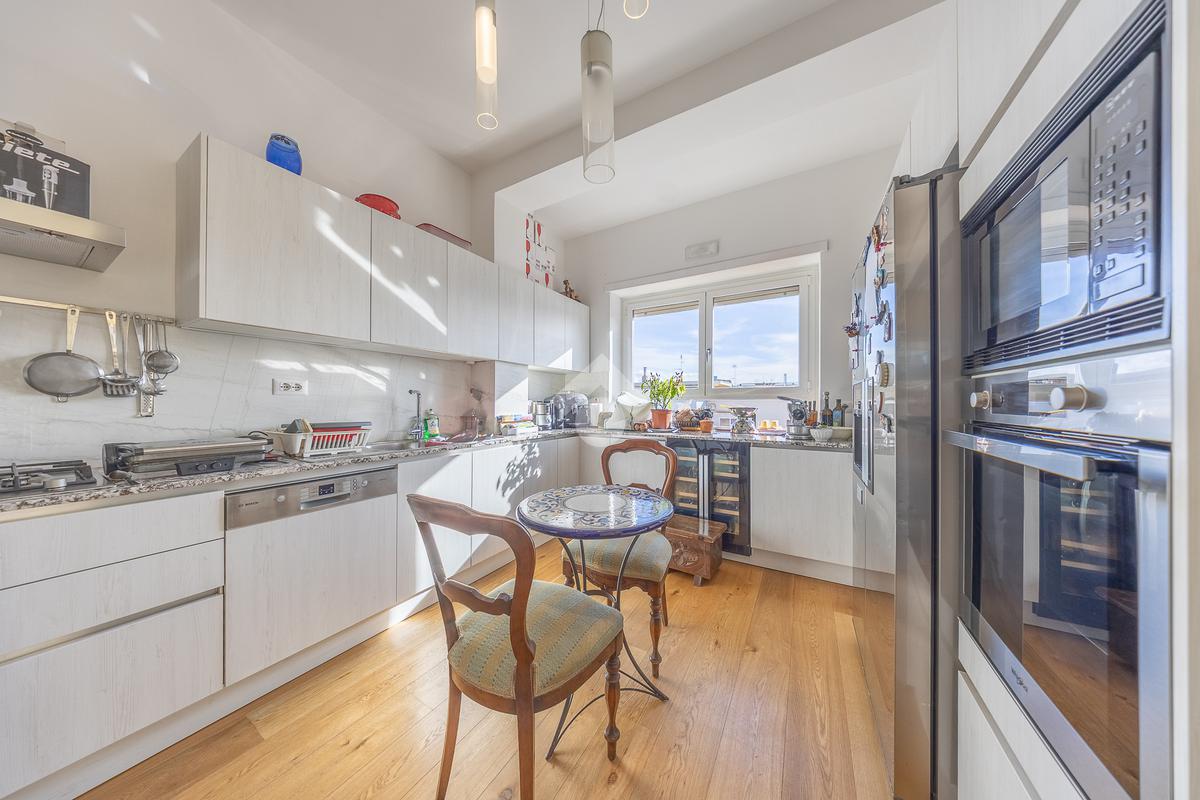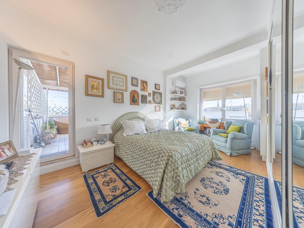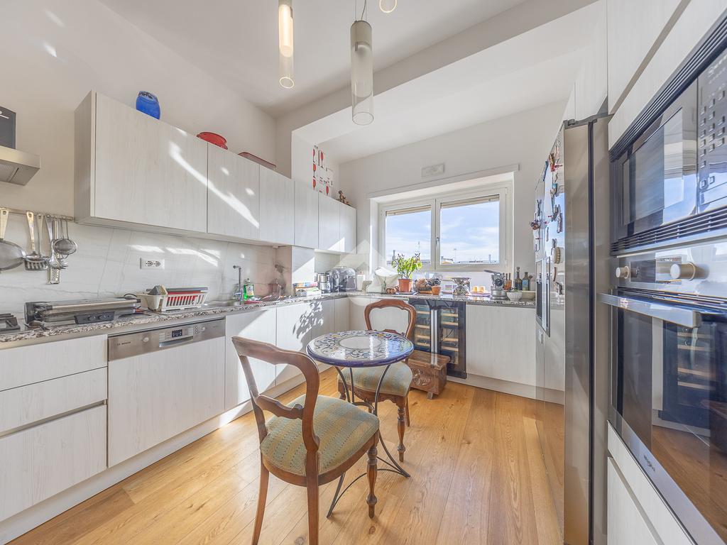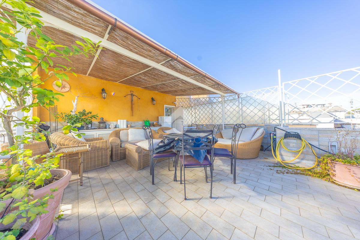 Posto al sesto piano, l’attico si compone di: ingresso, ampio salone, due camere da letto, cucina abitabile, due bagni di cui uno con cabina armadio e due splendidi terrazzi. Il primo regala una veduta straordinaria sulla Cupola di San Pietro, mentre il secondo è dotato di pergotenda domotica, ideale per vivere lo spazio esterno tutto l’anno grazie al tetto apribile. I terrazzi rappresentano un ambiente perfetto per pranzi all’aperto, momenti di relax e convivialità. In tutti gli ambienti sono presenti armadi fatti su misura da un falegname.