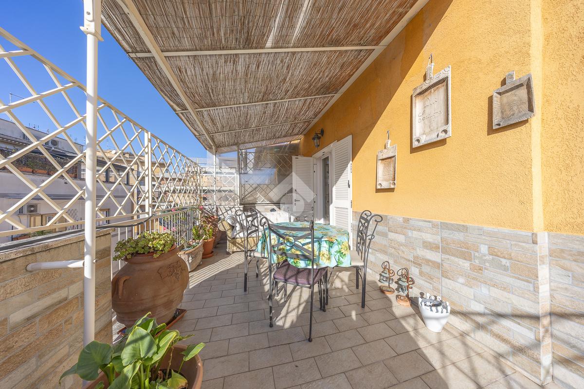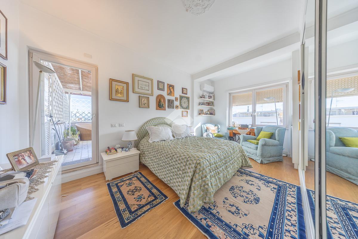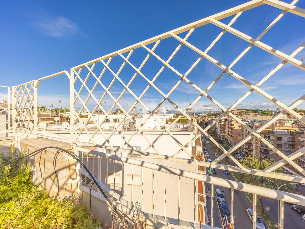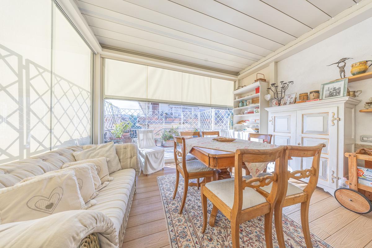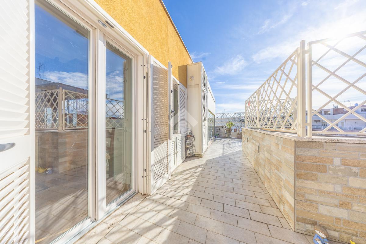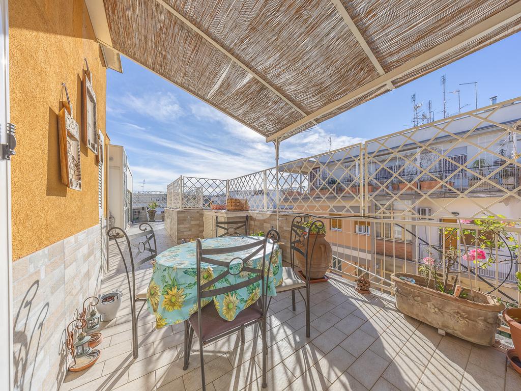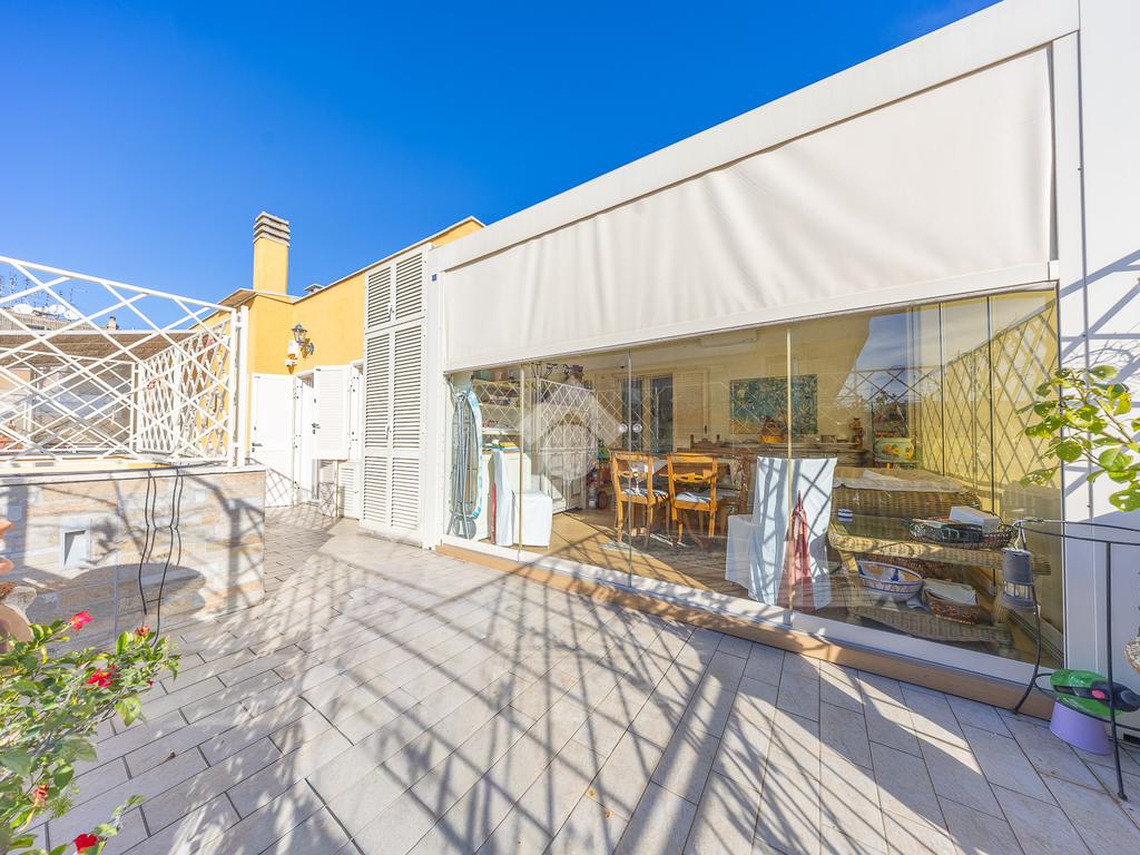 Posto al sesto piano, l’attico si compone di: ingresso, ampio salone, due camere da letto, cucina abitabile, due bagni di cui uno con cabina armadio e due splendidi terrazzi. Il primo regala una veduta straordinaria sulla Cupola di San Pietro, mentre il secondo è dotato di pergotenda domotica, ideale per vivere lo spazio esterno tutto l’anno grazie al tetto apribile. I terrazzi rappresentano un ambiente perfetto per pranzi all’aperto, momenti di relax e convivialità. In tutti gli ambienti sono presenti armadi fatti su misura da un falegname.