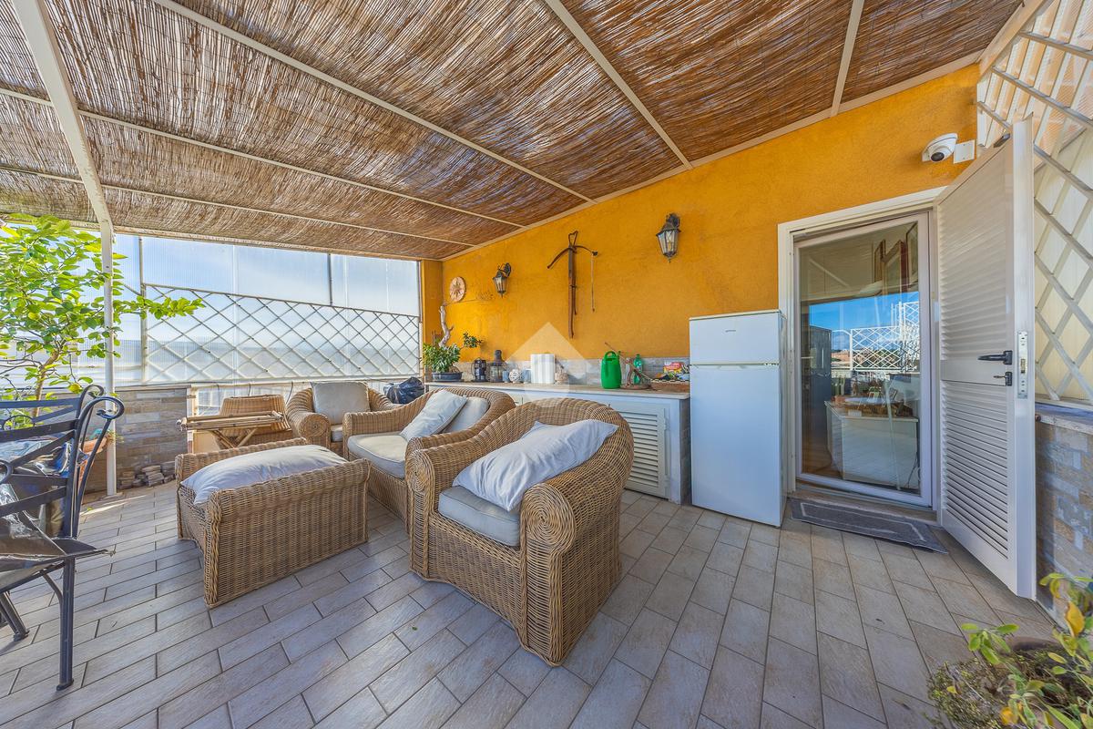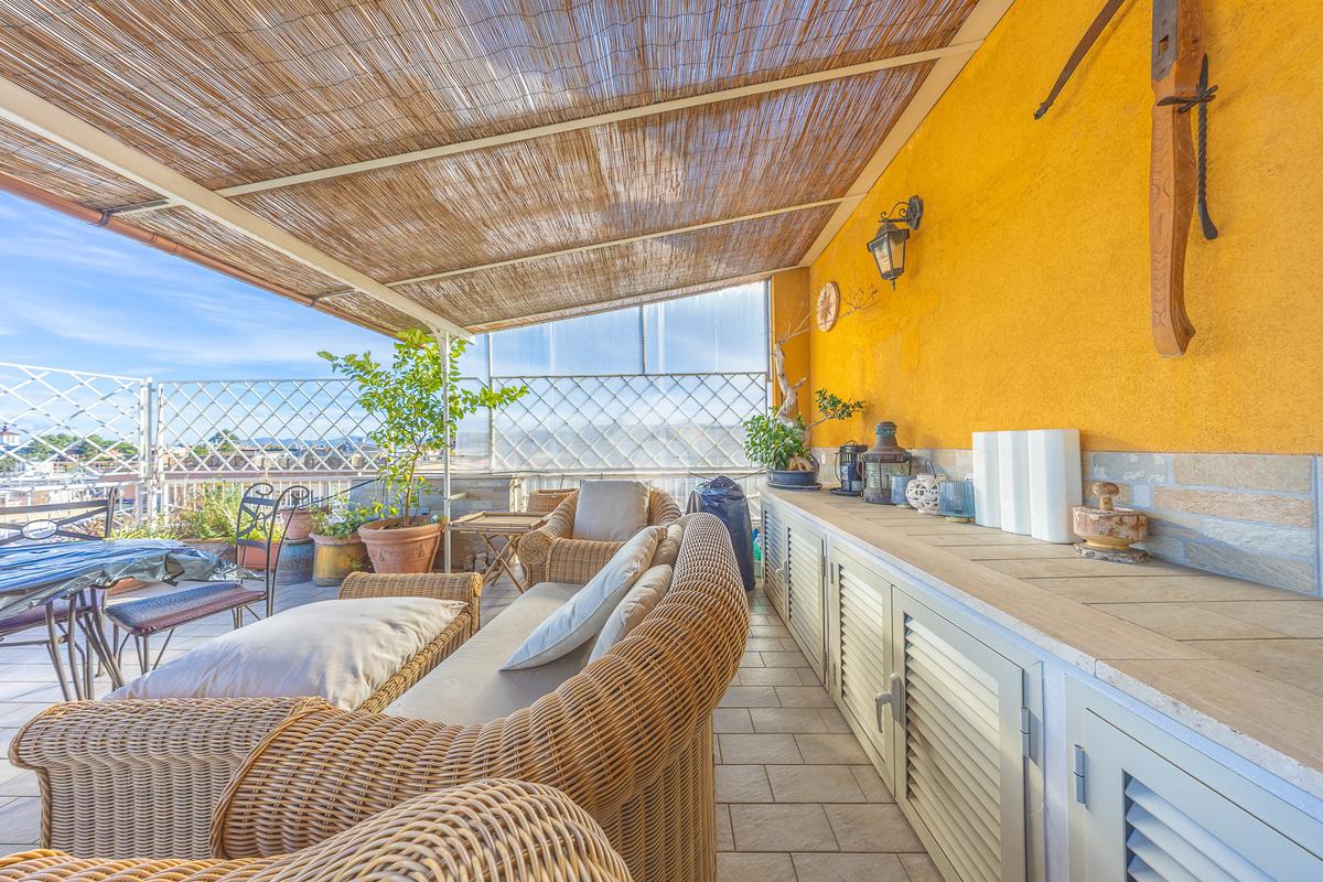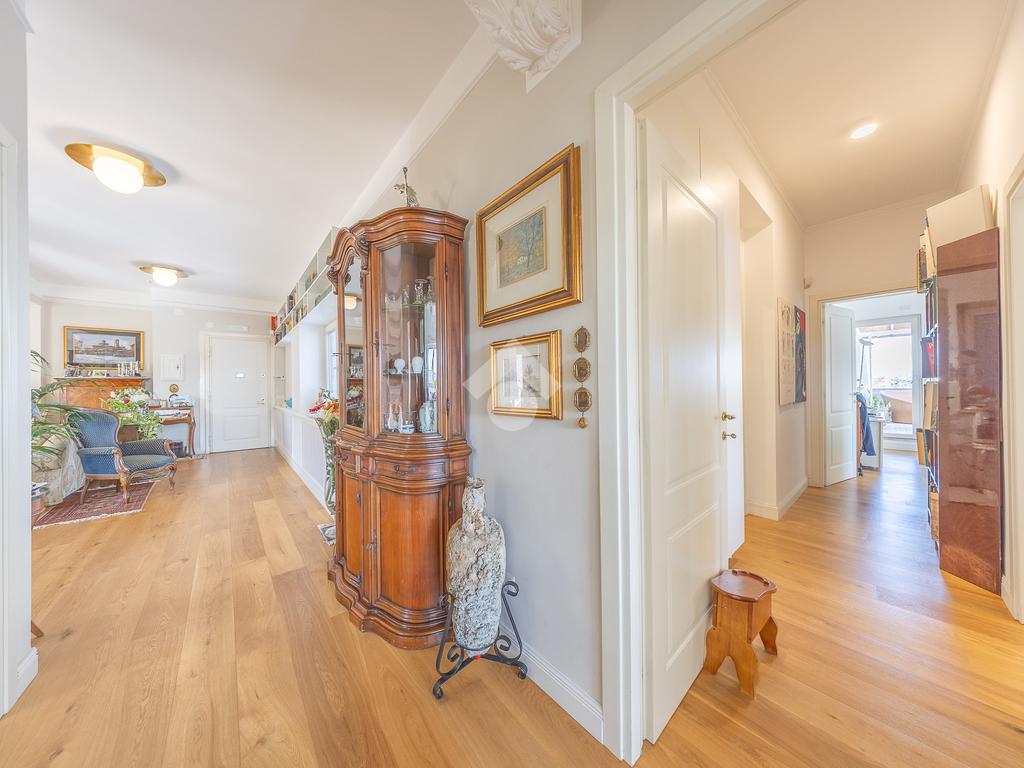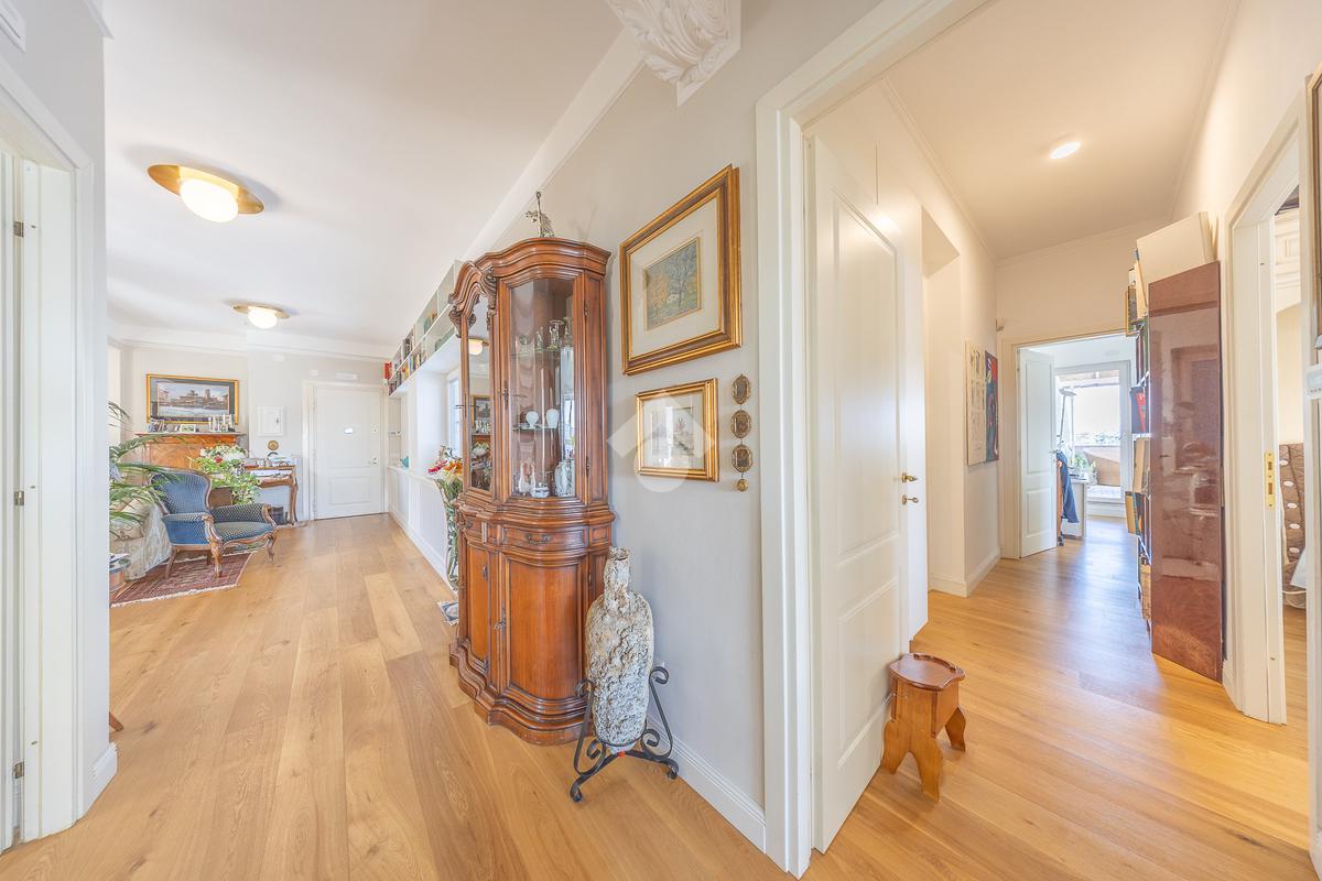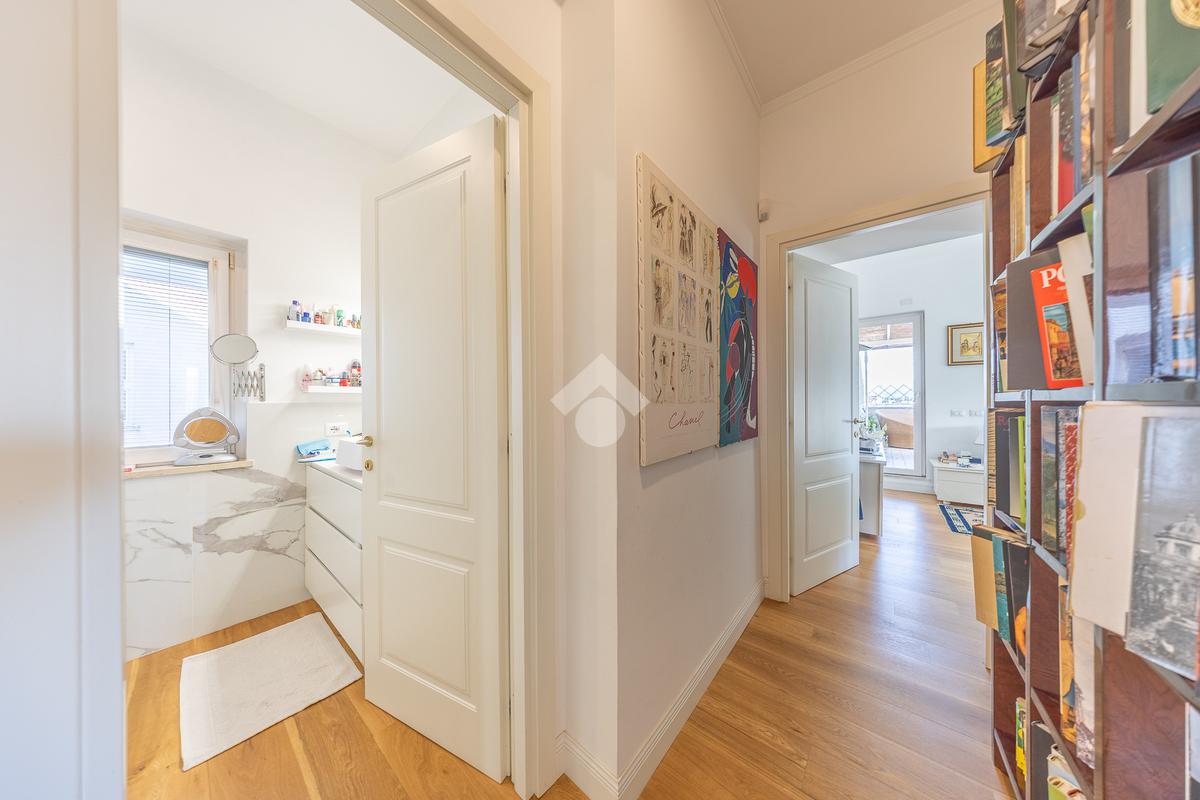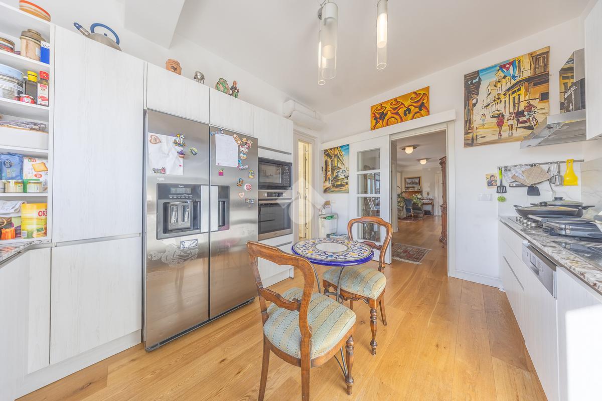 Posto al sesto piano, l’attico si compone di: ingresso, ampio salone, due camere da letto, cucina abitabile, due bagni di cui uno con cabina armadio e due splendidi terrazzi. Il primo regala una veduta straordinaria sulla Cupola di San Pietro, mentre il secondo è dotato di pergotenda domotica, ideale per vivere lo spazio esterno tutto l’anno grazie al tetto apribile. I terrazzi rappresentano un ambiente perfetto per pranzi all’aperto, momenti di relax e convivialità. In tutti gli ambienti sono presenti armadi fatti su misura da un falegname.