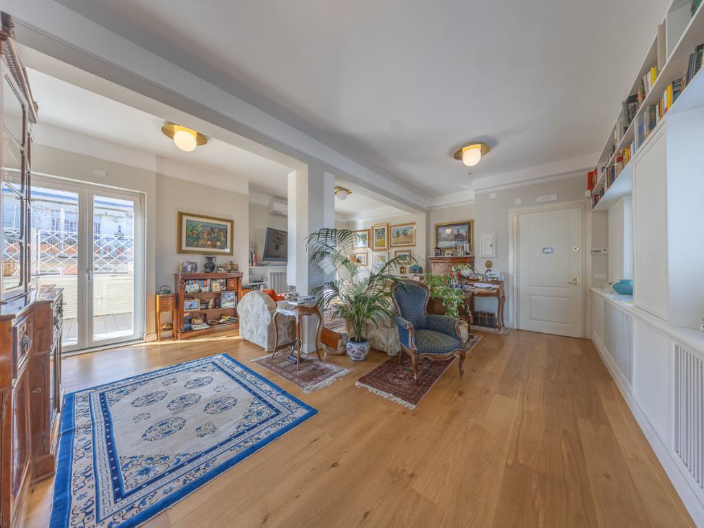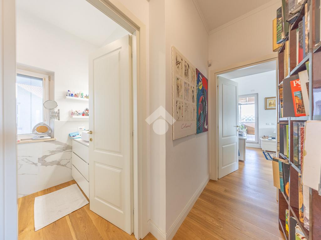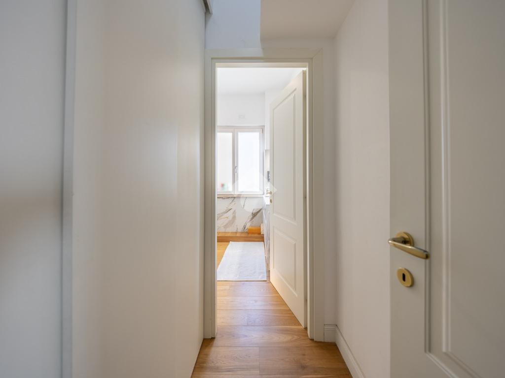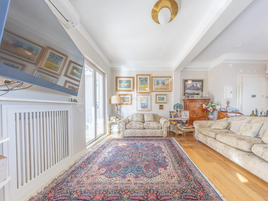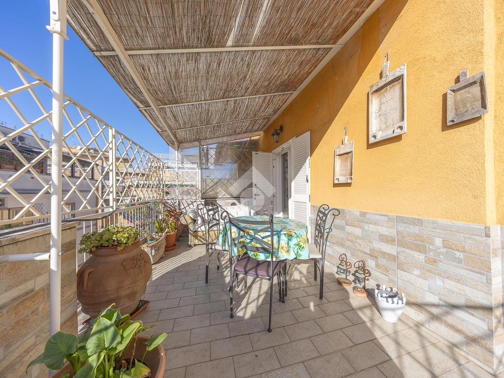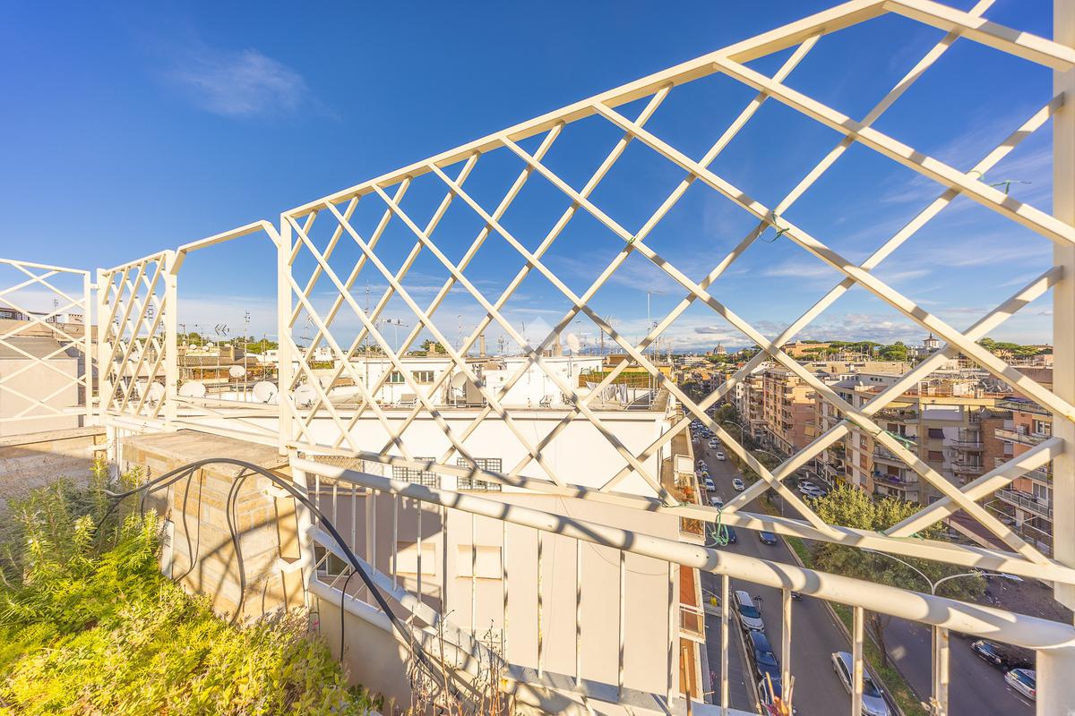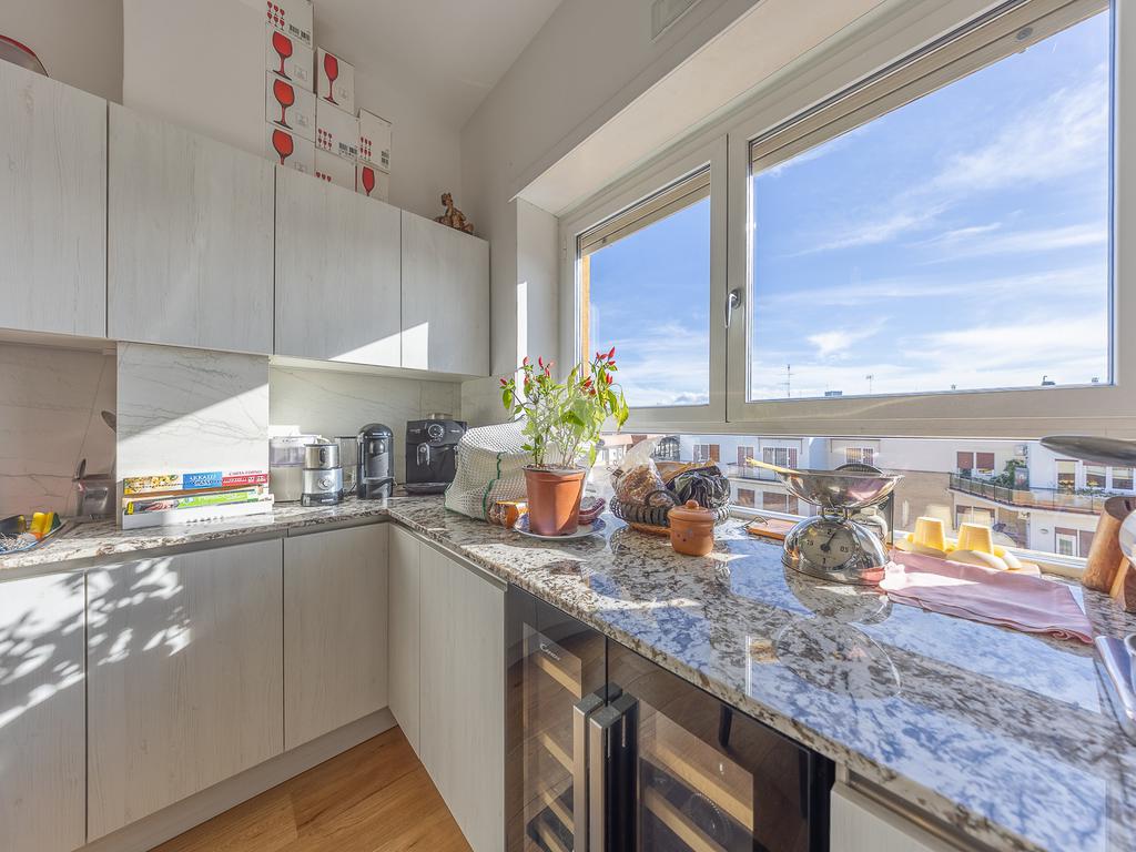 Posto al sesto piano, l’attico si compone di: ingresso, ampio salone, due camere da letto, cucina abitabile, due bagni di cui uno con cabina armadio e due splendidi terrazzi. Il primo regala una veduta straordinaria sulla Cupola di San Pietro, mentre il secondo è dotato di pergotenda domotica, ideale per vivere lo spazio esterno tutto l’anno grazie al tetto apribile. I terrazzi rappresentano un ambiente perfetto per pranzi all’aperto, momenti di relax e convivialità. In tutti gli ambienti sono presenti armadi fatti su misura da un falegname.
