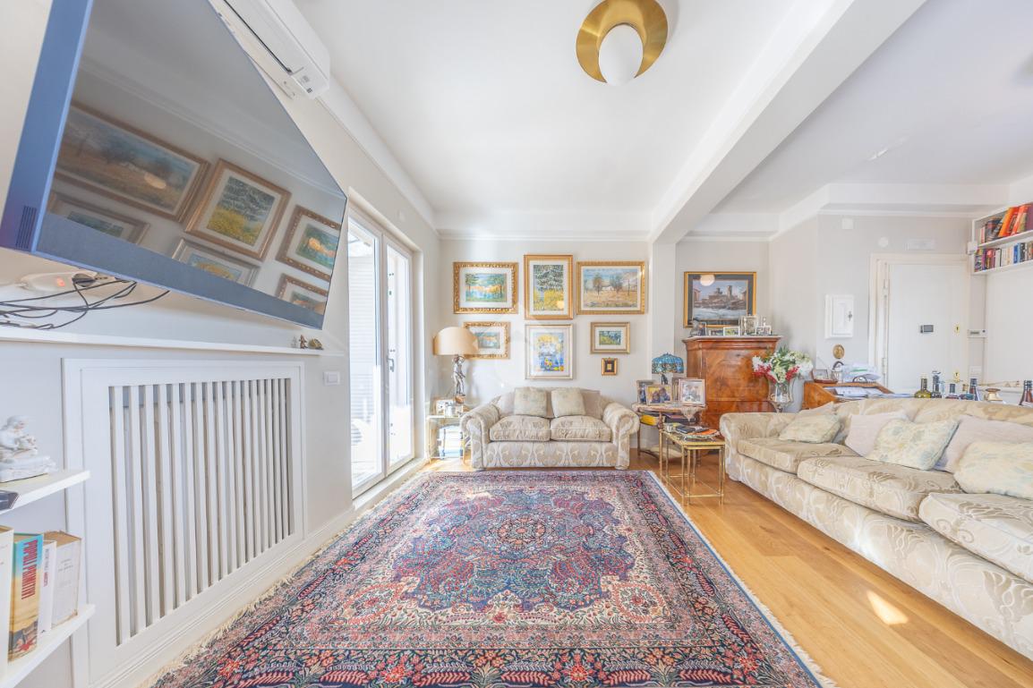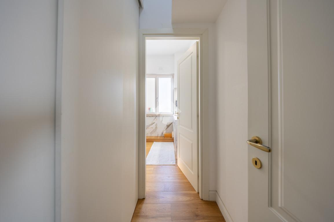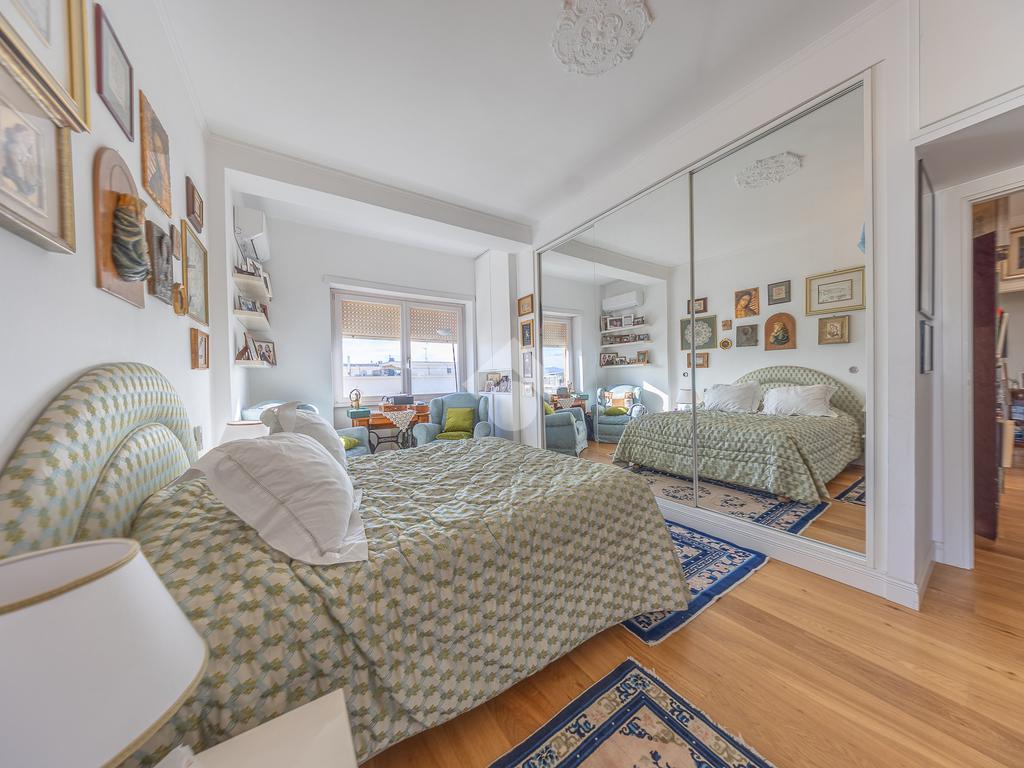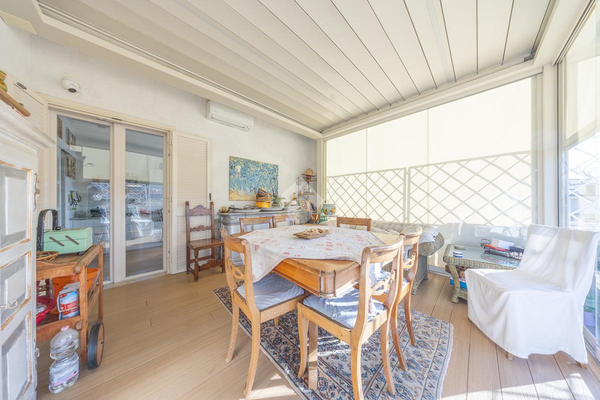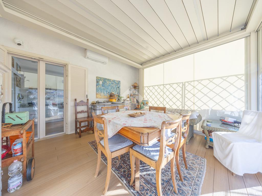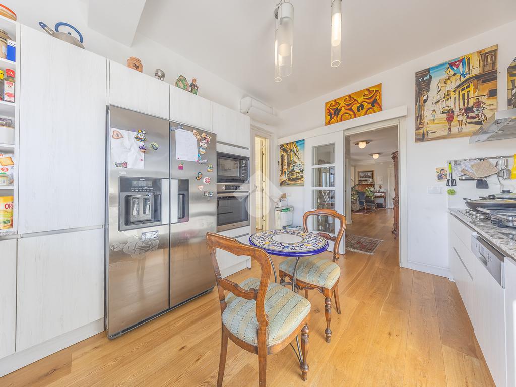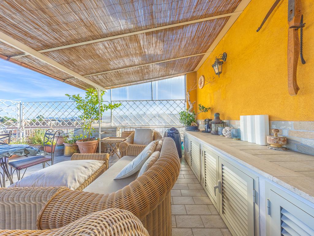 Posto al sesto piano, l’attico si compone di: ingresso, ampio salone, due camere da letto, cucina abitabile, due bagni di cui uno con cabina armadio e due splendidi terrazzi. Il primo regala una veduta straordinaria sulla Cupola di San Pietro, mentre il secondo è dotato di pergotenda domotica, ideale per vivere lo spazio esterno tutto l’anno grazie al tetto apribile. I terrazzi rappresentano un ambiente perfetto per pranzi all’aperto, momenti di relax e convivialità. In tutti gli ambienti sono presenti armadi fatti su misura da un falegname.