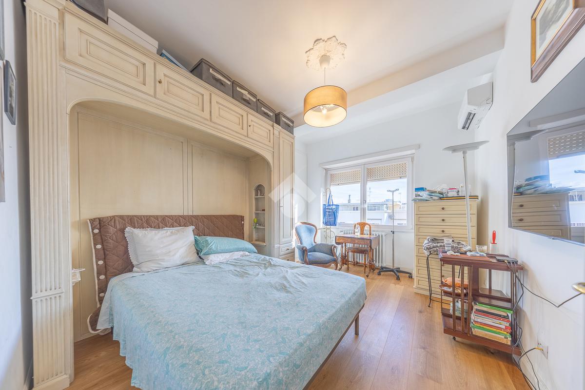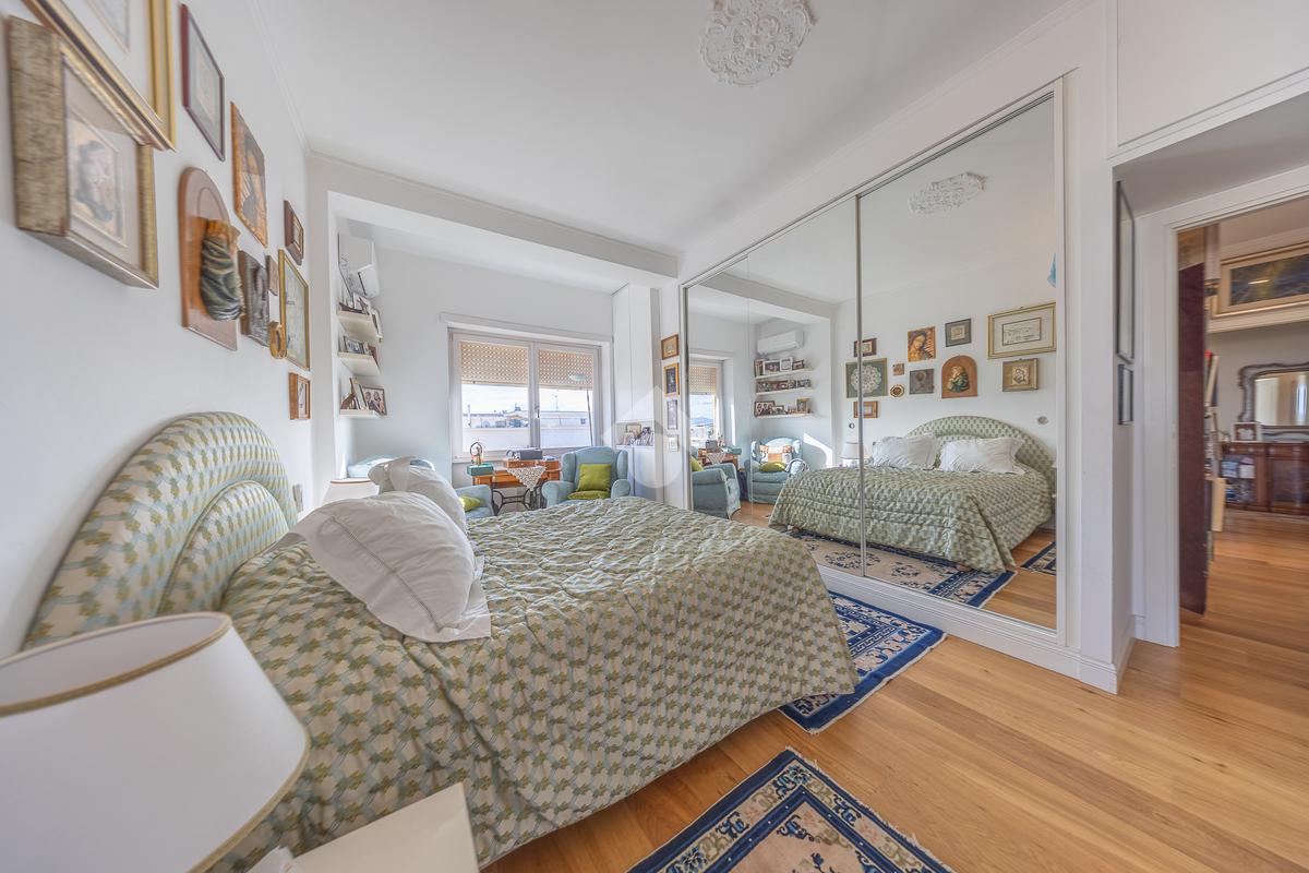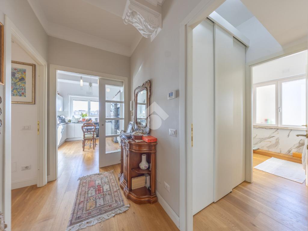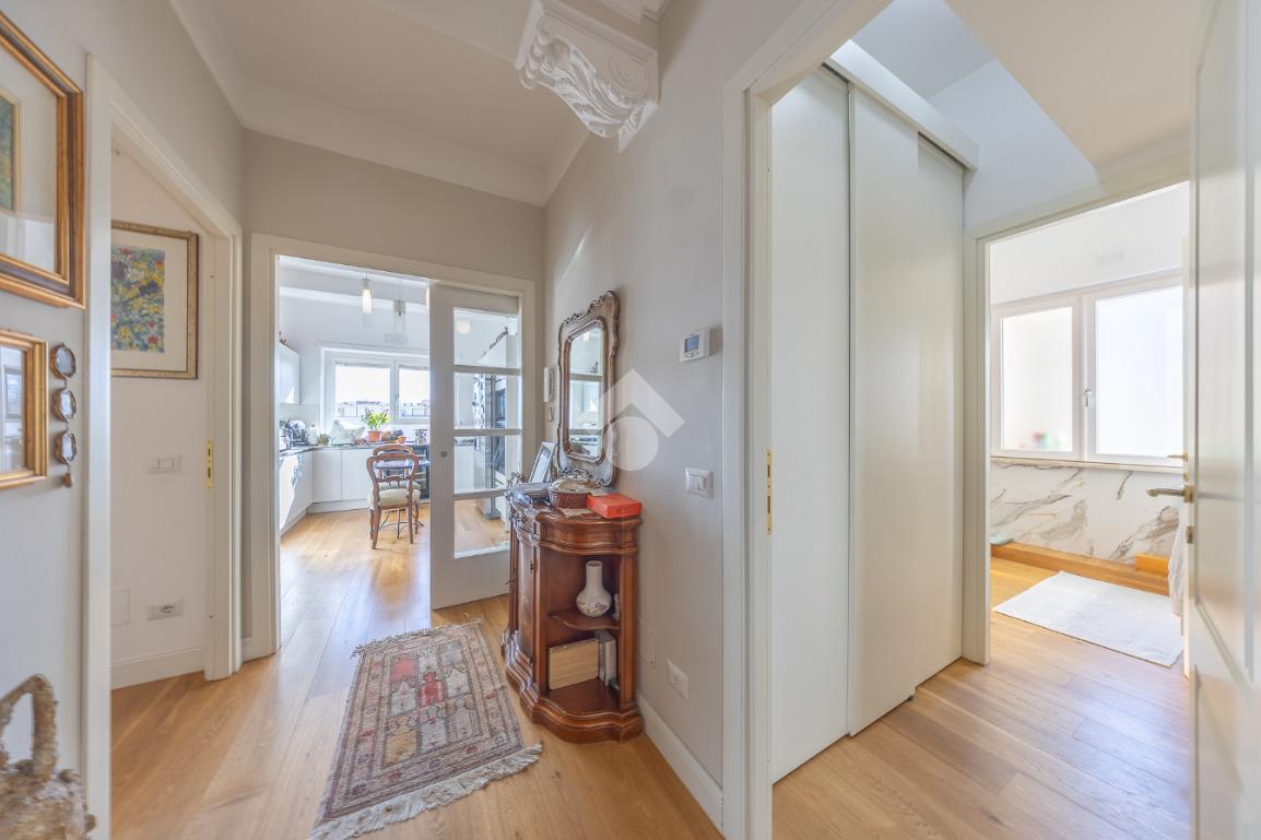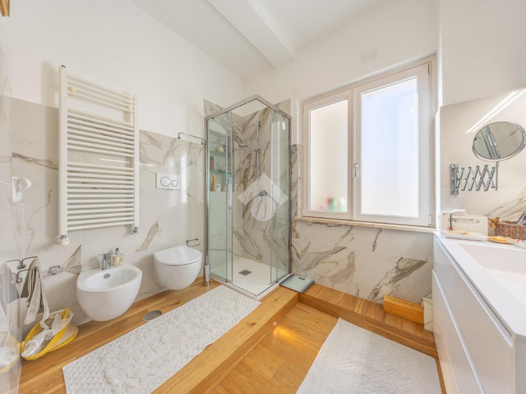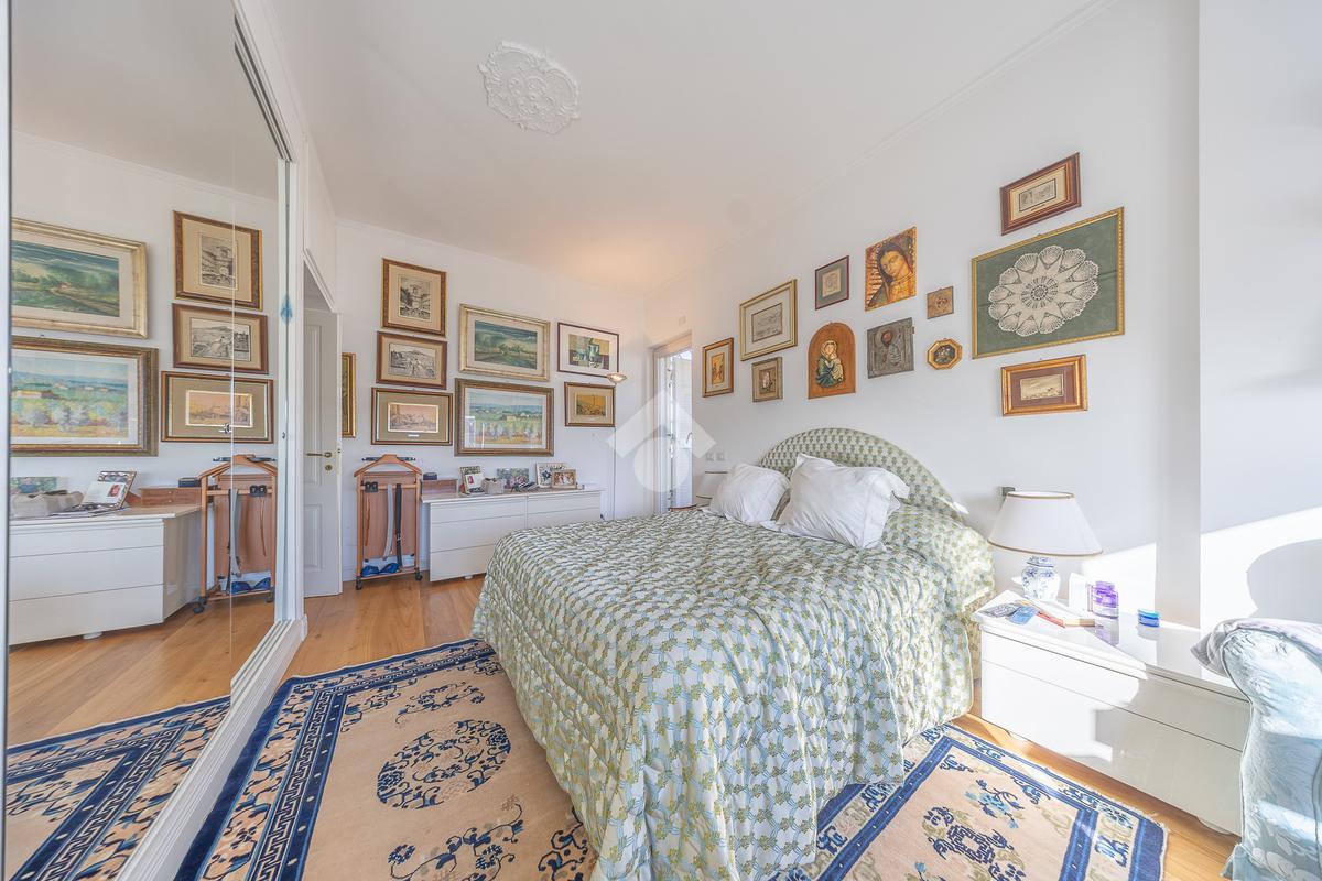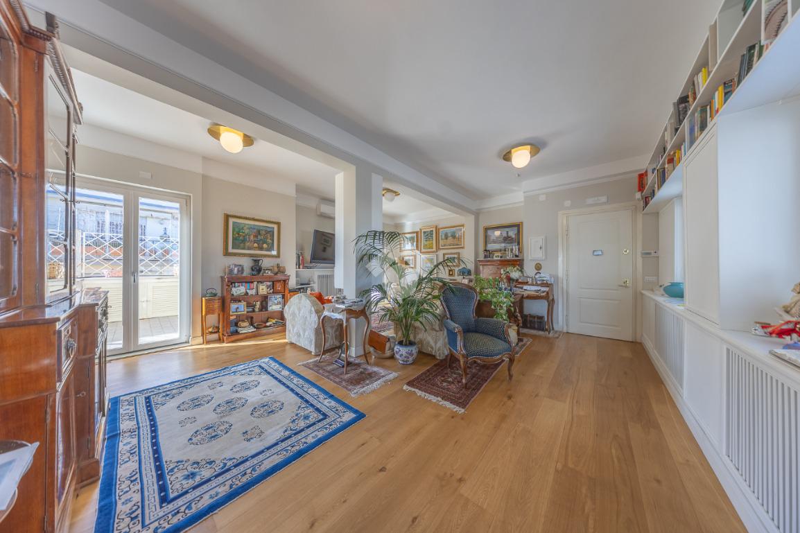Posto al sesto piano, l’attico si compone di: ingresso, ampio salone, due camere da letto, cucina abitabile, due bagni di cui uno con cabina armadio e due splendidi terrazzi. Il primo regala una veduta straordinaria sulla Cupola di San Pietro, mentre il secondo è dotato di pergotenda domotica, ideale per vivere lo spazio esterno tutto l’anno grazie al tetto apribile. I terrazzi rappresentano un ambiente perfetto per pranzi all’aperto, momenti di relax e convivialità. In tutti gli ambienti sono presenti armadi fatti su misura da un falegname.