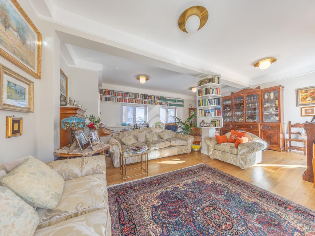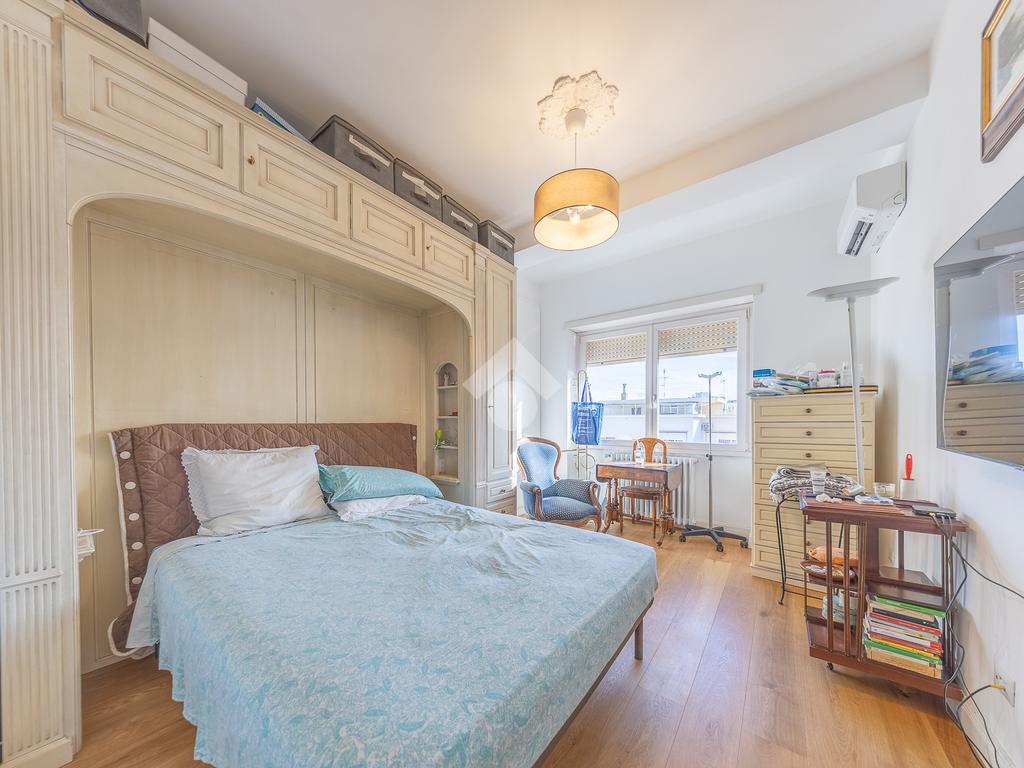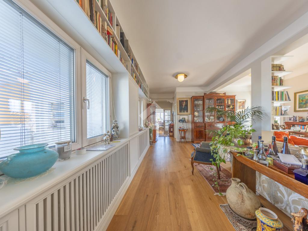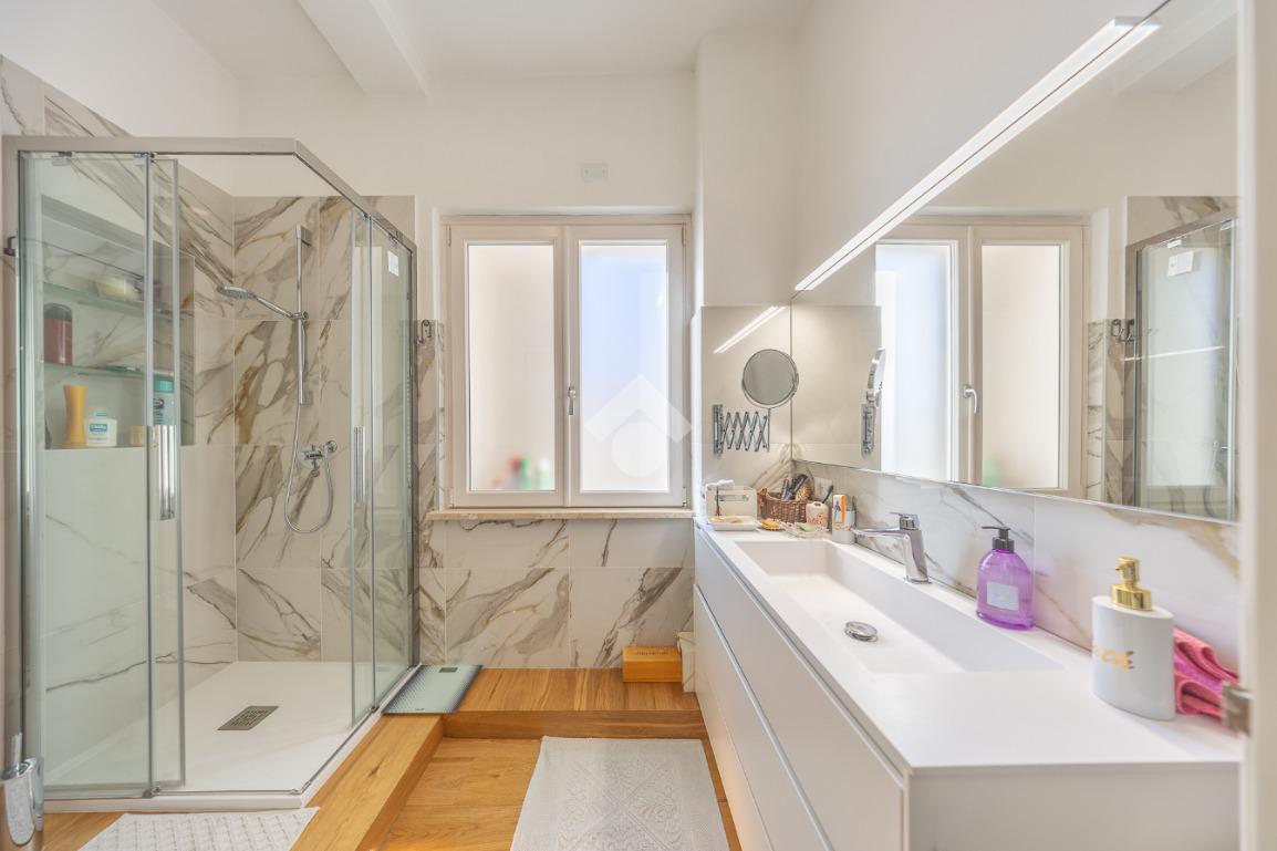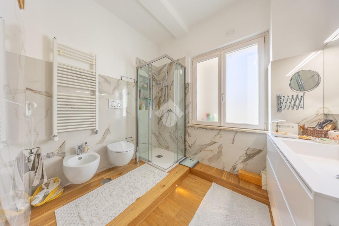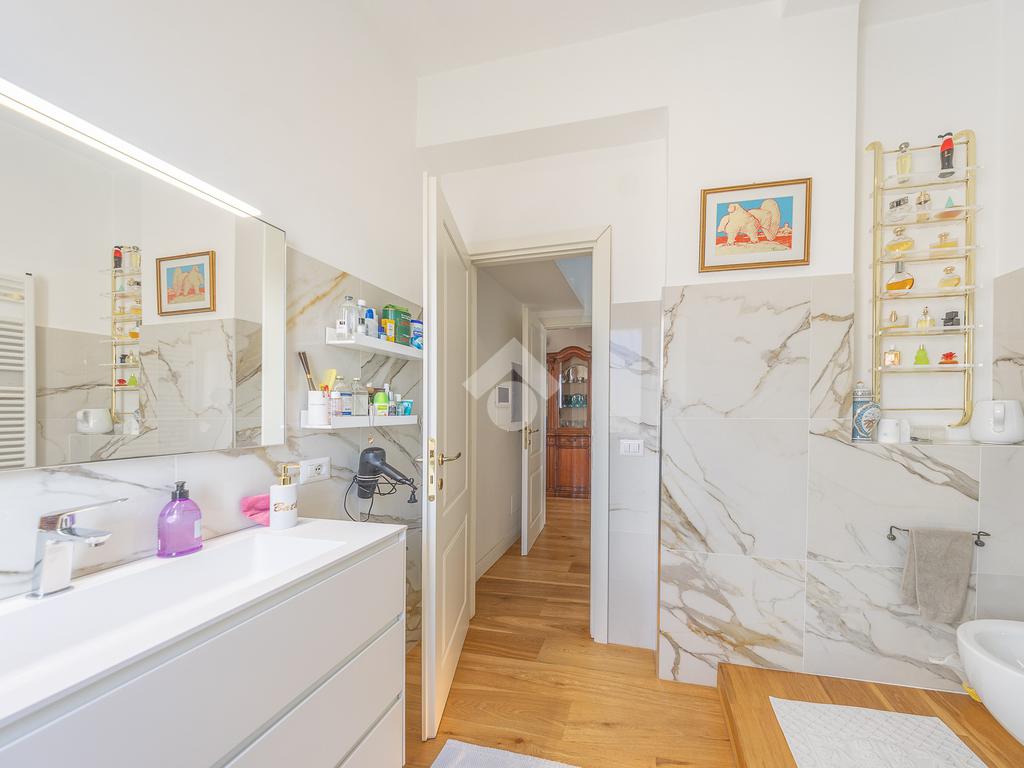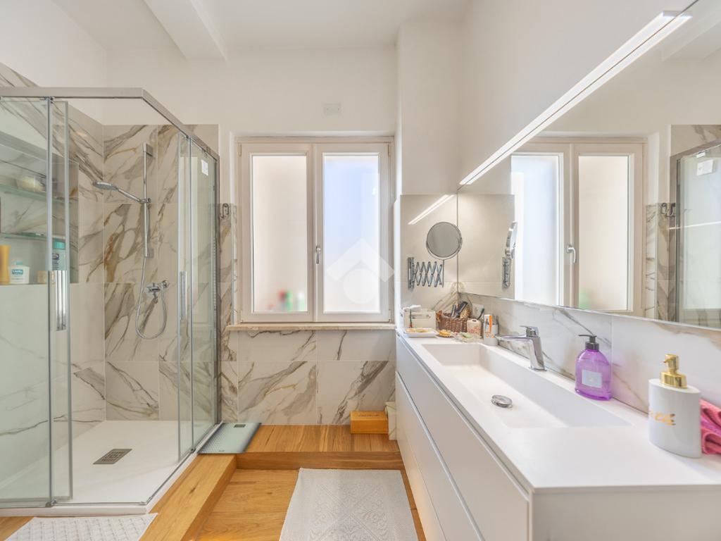 Posto al sesto piano, l’attico si compone di: ingresso, ampio salone, due camere da letto, cucina abitabile, due bagni di cui uno con cabina armadio e due splendidi terrazzi. Il primo regala una veduta straordinaria sulla Cupola di San Pietro, mentre il secondo è dotato di pergotenda domotica, ideale per vivere lo spazio esterno tutto l’anno grazie al tetto apribile. I terrazzi rappresentano un ambiente perfetto per pranzi all’aperto, momenti di relax e convivialità. In tutti gli ambienti sono presenti armadi fatti su misura da un falegname.